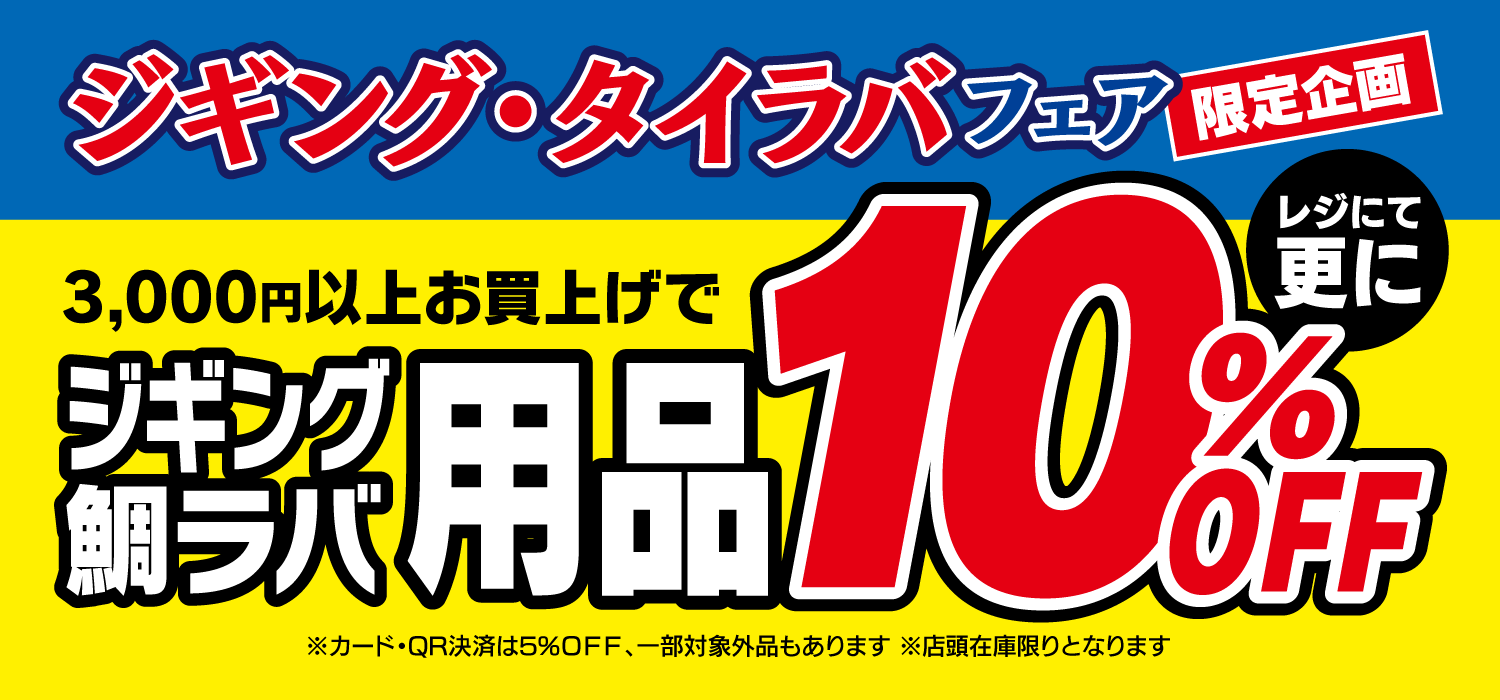 ジギング用品・タイラバ用品を3000円以上お買い上げでレジにて更に10%OFF!
